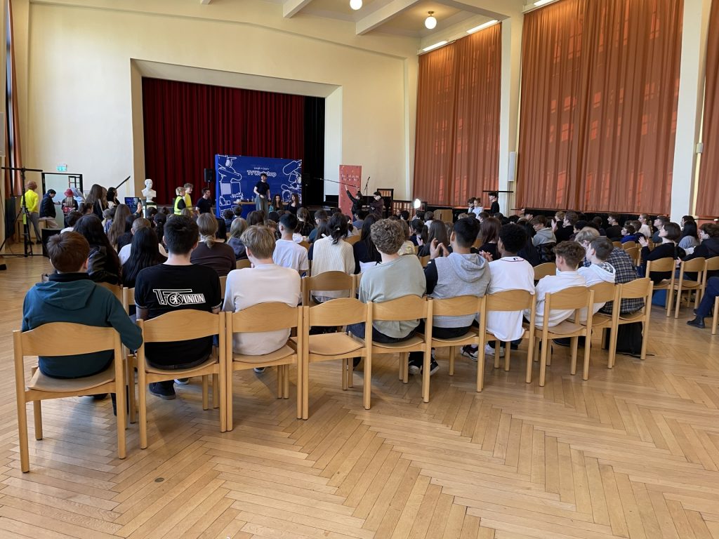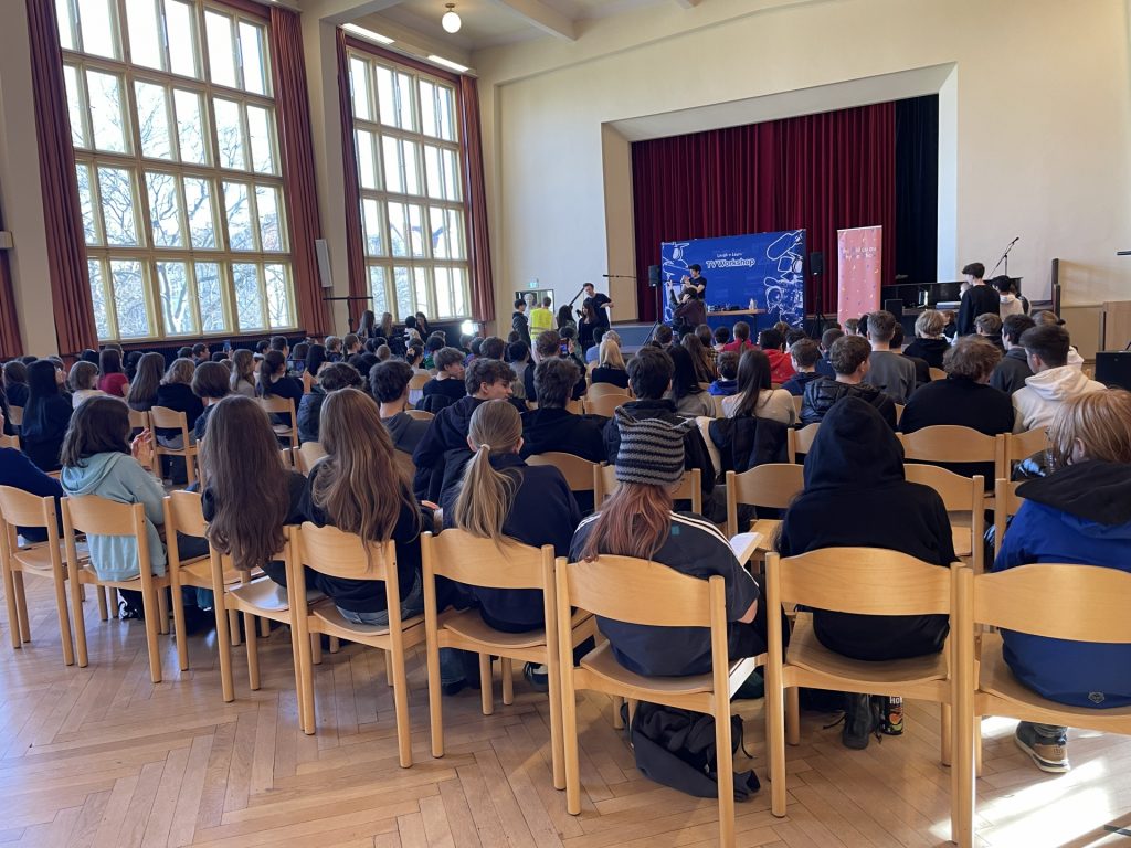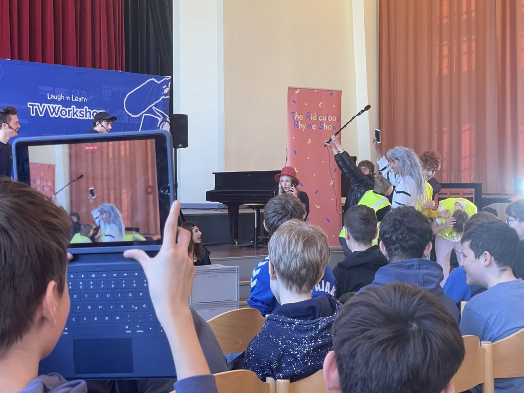 Am 26. Februar 2026 fand an unserer Schule erstmalig ein Medienworkshop für die 8., 9. und 10. Klassen statt. Dabei haben zwei TV-Schauspieler des BBC aus dem Vereinigten Königreich den Workshop „Behind the Scenes Fernseh- und Medienworkshop“ durchgeführt und den Schülerinnen und Schülern einen Einblick in die Abläufe hinter den Kulissen eines Fernsehstudios gegeben. Es wurden bunte Kostüme getragen; Kameras, Mikrofone und Tablets eingesetzt. Die Aula wirkte durch die sympathische Aura der jungen Künstler belebt, welche durch ihr authentisches Englisch und ihre jahrelange Berufserfahrung beeindrucken konnten. Am Schluss gab es Applaus und sogar Autogramme!